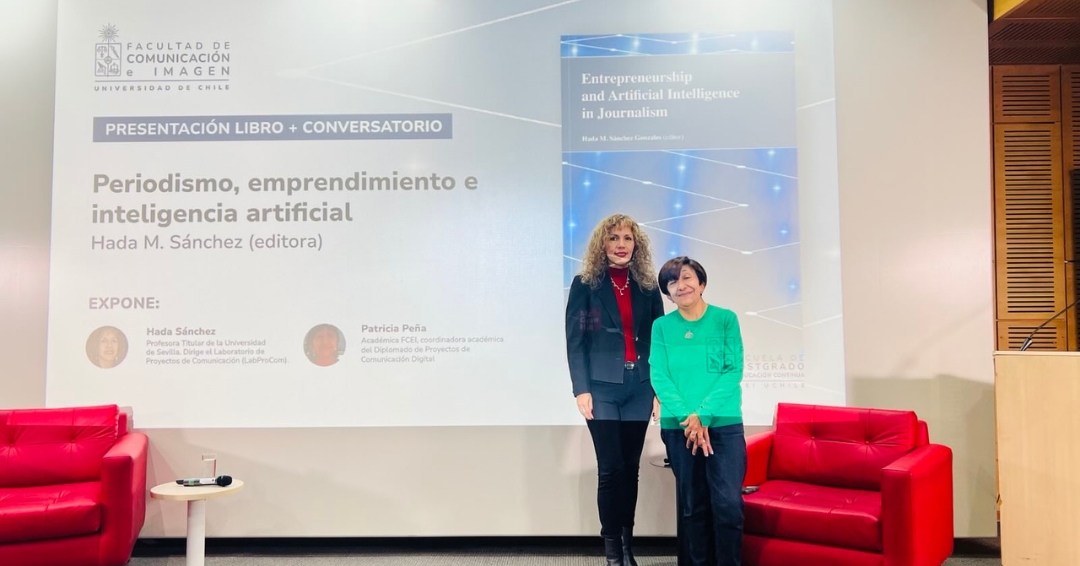 El pasado miércoles 30 de julio, la co-investigadora del proyecto Fondecyt sobre #RegulaciónConvergente presentó el libro “Entrepreneurship and Artificial Intelligence in Journalism” en el Auditorio Carmen Bueno – Jorge Müller de la Facultad de Comunicación e Imagen (FCEI) de la Universidad de Chile. Patricia Peña junto a la editora del libro, Hada Sanchez, de la Universidad de Sevilla, presentaron esta obra colectiva que fue redactada en conjunto a otros autores internacionales.